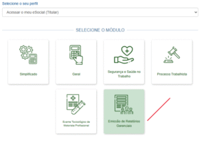 O acesso é feito pelo próprio portal do eSocial, utilizando certificado digital. Após o login, basta selecionar o perfil desejado e clicar no card “Emissão de Relatórios Gerenciais”.
